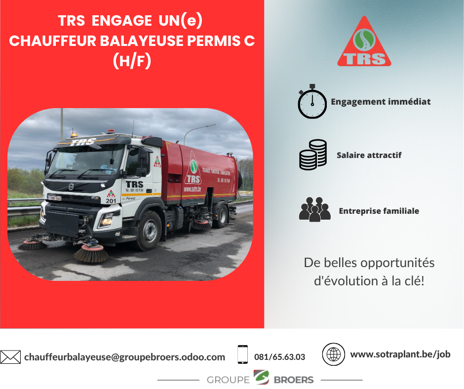 Si vous souhaitez rejoindre notre équipe, nous vous invitons à nous adresser votre curriculum vitae à l’adresse suivante : chauffeur.balayeuse@groupebroers.odoo.com